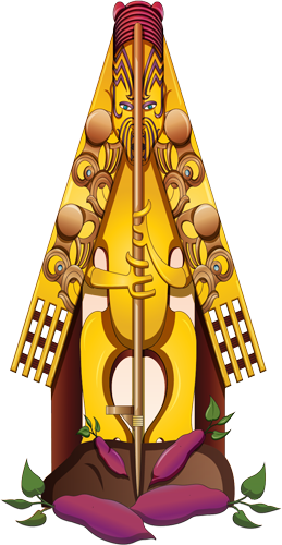 Rongo is holding a kō, a digging implement. The colour purple is his/her main colour representing the kumara but also associated with wealth, abundance, peace, wisdom and royalty.